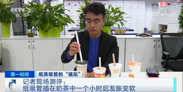 记者现场测评:纸吸管插在奶茶中一个小时后发胀变软