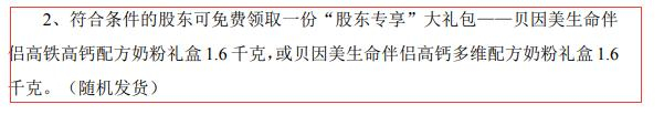 2月5日下午,贝因美发布公告称,为了答谢各位股东长期以来对公司的关心和支持,公司决定开展“牛转乾坤·贝因美股东回馈活动”。参加活动的股东范围为2021年1月18日下午收市时,在中国证券登记结算有限责任公司登记在册的持股1万股以上的本公司股东。符合条件的股东可免费领取一份“股东专享”大礼包——贝因美生命伴侣高铁高钙配方奶粉礼盒1.6千克,或贝因美生命伴侣高钙多维配方奶粉礼盒1.6千克。