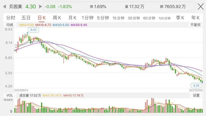 二级市场上,2月5日,贝因美股价高开后一路震荡走低,截至收盘,跌1.83%,报收4.3元/股,最新市值43.97亿元。
