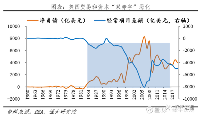 一是居民低储蓄、高消费盛行,贸易赤字成常态。1980年以来,宽松的货币环境和金融创新下,美国个人消费支出占GDP比重从60%快速升至68%,而居民储蓄率从11.4%降至7.5%,金融危机时一度降至3.6%。根据国民经济恒等式,Y=C+I+G+NX,Y-C=S=I+G+NX,低储蓄和高消费模式下,净出口NX必然持续为负,贸易赤字占GDP比重从0.68%扩大至2.7%。