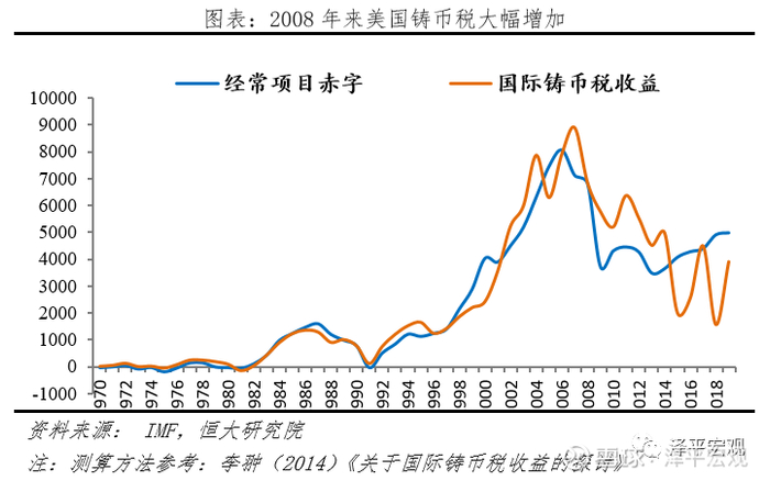 一是美元霸权征收铸币税,输出通胀使债务贬值。凭借外围国家对美元的储备需求,美国向全世界征收铸币税,低成本获取他国的产品和服务。美国支付美元获取他国经济资源,若他国将美元储备下来,美国获得国际铸币税收益,其代价是美国政府需要为他国持有美元储备而支付利息。据测算,美国在1970-1980年每年平均国际铸币税为85.25亿美元,2001-2010年高达6345.93亿美元。