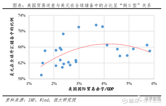 一是理论上看,美元霸权面临“特里芬难题”,双赤字难以持续。特里芬难题是指美元作为国际储备货币无法在为世界提供流动性的同时确保币值稳定。20世纪70年代后美国开始出现“双赤字”,90年代后作为中心国的美国经济不断空心化。拟合1994-2019年美元在全球外汇储备中的比例与美元经常项目赤字的数据,两者呈现“倒U型”关系,贸易赤字占GDP比重超过4%,外围国家对美元信心下降,其他货币部分取代美元成为外汇储备。