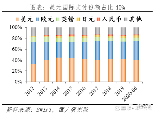 贸易层面, 2009年启动人民币结算试点以来,人民币结算的跨境贸易占中国进出口比重从2010年2.5%提升至2019年20%。从全球来看,2011-2019年人民币全球支付份额从0.29%升至1.94%,目前是全球第6大支付货币。