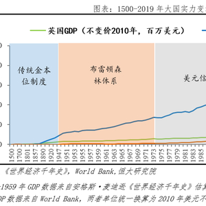 19世纪初,英国率先完成工业革命,为满足战争筹资和殖民扩张需要,1816年英国确立金本位制,通过贸易、殖民等方式将英镑主导的金本位制推向世界,1860-1914年约60%国际贸易以英镑结算,1913年英镑在各国官方外汇储备中占38%。这一时期,尽管美国在1894年GDP赶超英国,但美元并未成为世界货币,1913年美元占外汇储备份额不足5%。直到两次世界大战后,英国实力和国际地位下降,逐渐失去对国际货币体系的掌控,1931年英国宣布放弃金本位,结束了延续一百年的英镑霸权。
