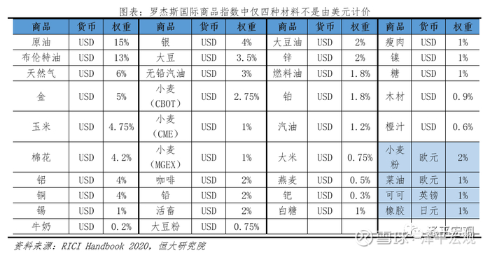美元与国际大宗商品计价挂钩,任何从事该种商品交易的国家和公司都需要储备美元,增加美元需求。联合国贸易和发展会议发布的81种原材料价格序列,只有5种不是以美元计价;最新罗杰斯国际商品指数(RICI)覆盖共38种商品期货合约,其中仅有可可、橡胶、大麦、菜籽油等四种原材料不是以美元计价,权重占比仅为5%。
