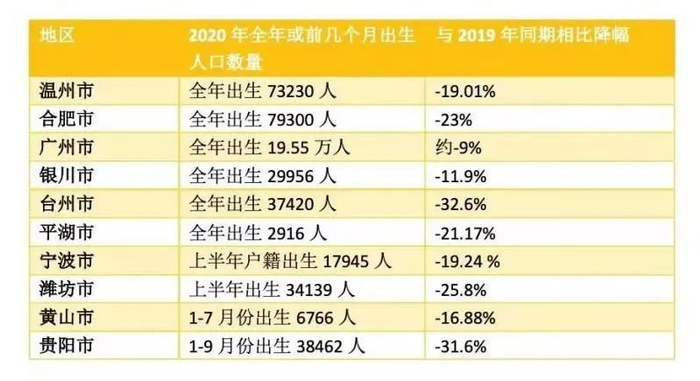 据温州健康妇幼指导中心的数据,2020年温州地区58家助产机构住院分娩活产数73230,比上年同期减少19.01%;据合肥市新闻办的数据,2020年合肥出生人口7.93万人,同比去年下降约23%;广州媒体也报道,2020年广州全市新出生19.55万,同比去年下降约9%。