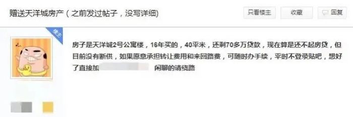近日,新京报记者核实发现,该消息属实。由于“资不抵债”,网名为“厚土”的该业主准备将位于河北燕郊天洋城这套40平方米的房子赠与别人,目前还剩70多万贷款。不过,该事件目前仍是个案,未有大规模类似情况出现。