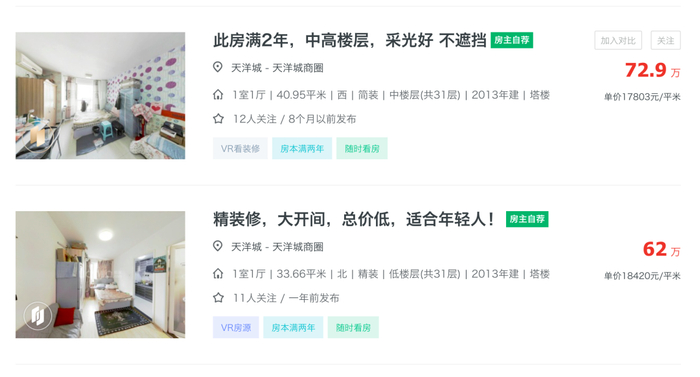 “房子在燕郊天洋广场,2016年买的,40平方米70年产权住宅,西向,总价78万元。”