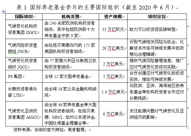 组建产业联盟、签署责任投资倡议或参加气候相关国际组织,是养老基金落实可持续投资的重要途径。自2006年联合国《负责任投资原则》发布以来,将ESG原则纳入资产管理已成为国际共识(UNEP,2009)。越来越多养老基金加入各类国际合作倡议、组织或联盟,共同应对气候变化。荷兰公共部门集体养老金主动与其他养老基金或金融机构合作,通过经验交流、联合行动等方式,推动可持续金融市场建设,并对投资标的可持续经营施加更大影响。挪威政府养老基金主动参加15个可持续投资相关国际组织,加拿大退休金计划(CPP)参加了17个绿色相关国际组织,瑞典公共养老金AP1参与了27个气候变化相关国际倡议与组织。国际大型养老基金通过可持续投资倡议或组织,可推广气候风险管理的最佳实践,推动构建可持续投资相关分类标准与信息披露一致性准则,参与ESG指数构建和产品可持续性评级,促进可持续投资政策修订,完善资产管理者、资产所有者和标的企业治理结构(详见表1)。
