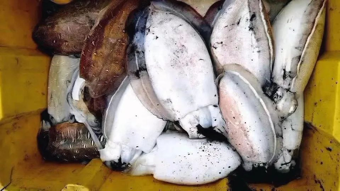 新鲜捕捞的东海墨鱼,人工洗净分切,再以特定的比例,部分分切好的墨鱼肉打碎成浆,随后再加入剩余的墨鱼肉粒。