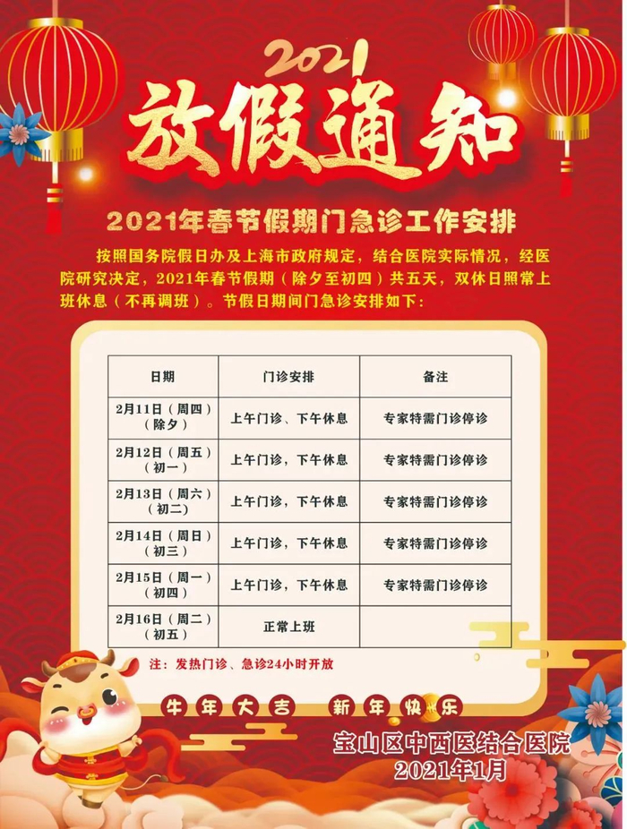 2021年“春节”假期即将到来,万一遇到伤风感冒,沪上医院的门急诊都是怎么安排的?哪些医院停诊?市卫健委今天公布了本市三级医院的门急诊放假安排,收藏一下,有备无患!(PS:部分医院假期安排待更新,信息仅供参考,以各医院实际安排为准)详见↓