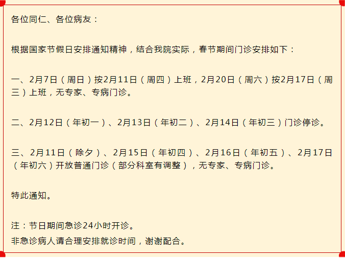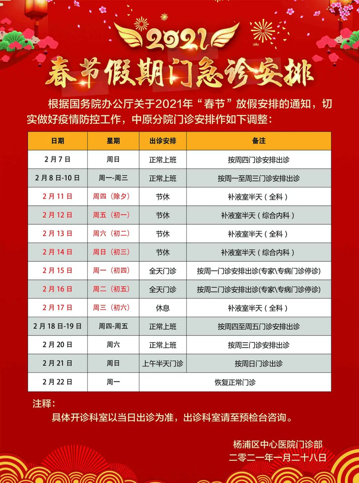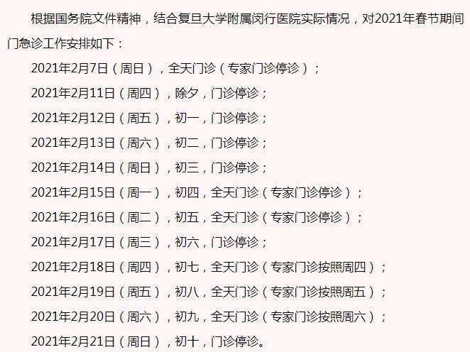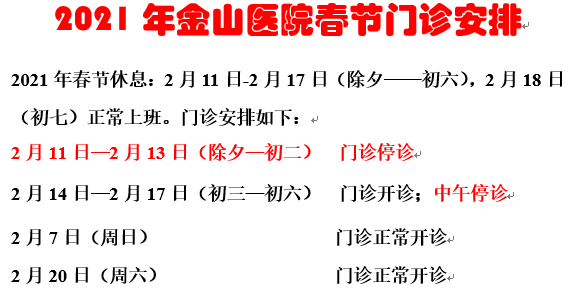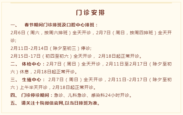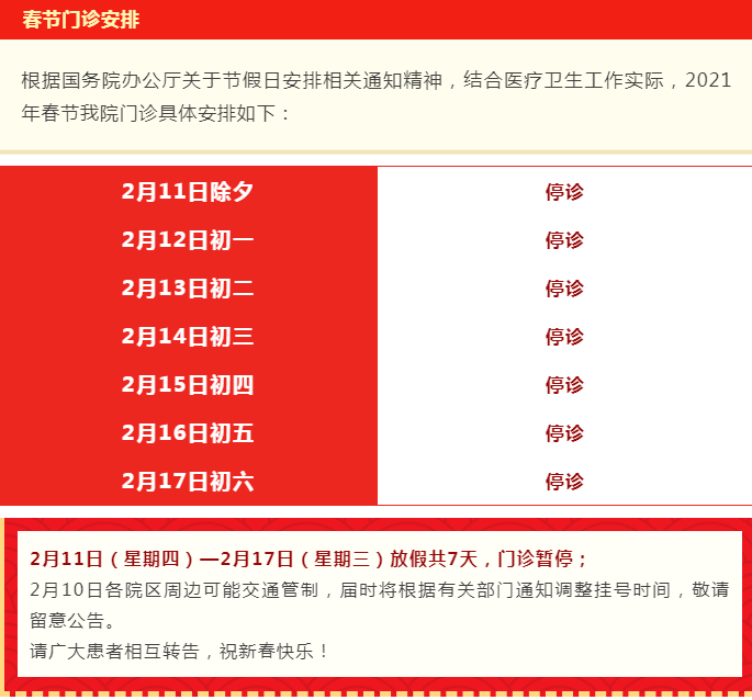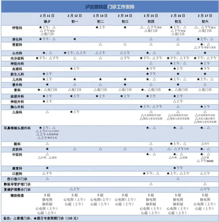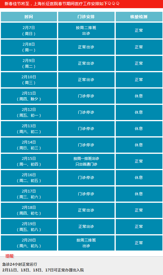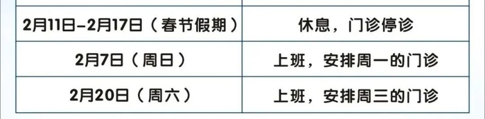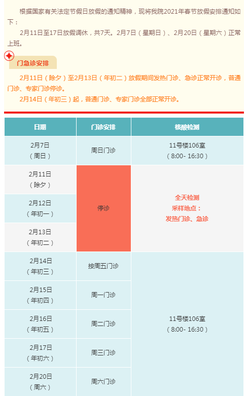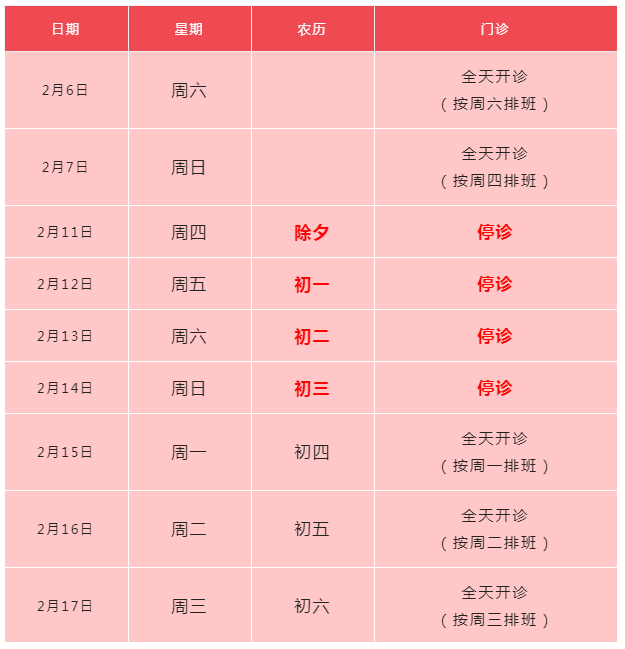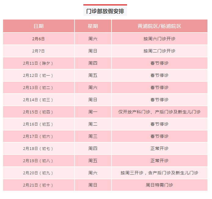 2月11日(周四)-2月17日(周三)门诊工作安排见下表。2月18日起各门诊照常开诊。2月7日、2月20日按原双休日门诊照常开诊。