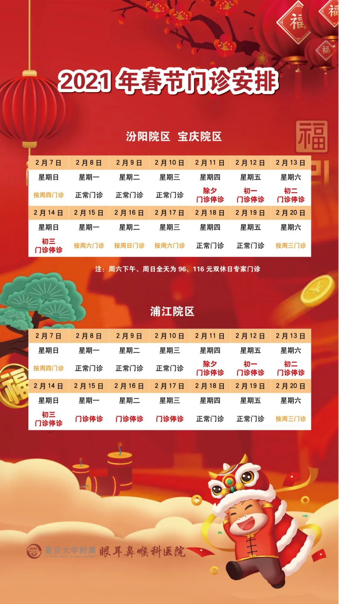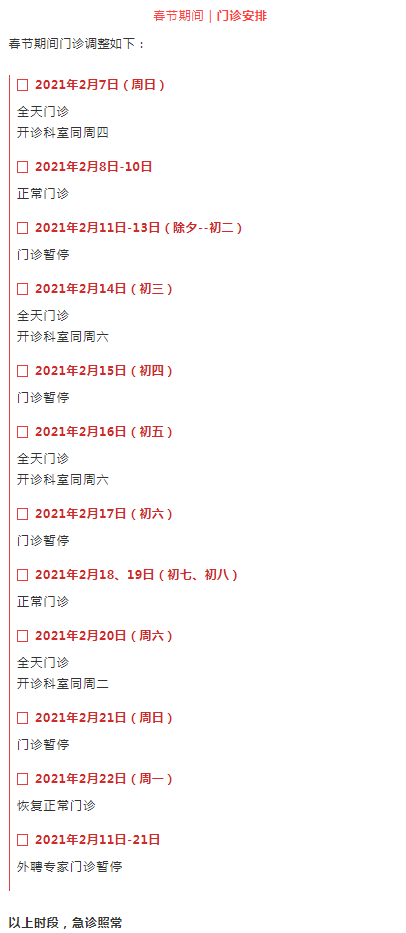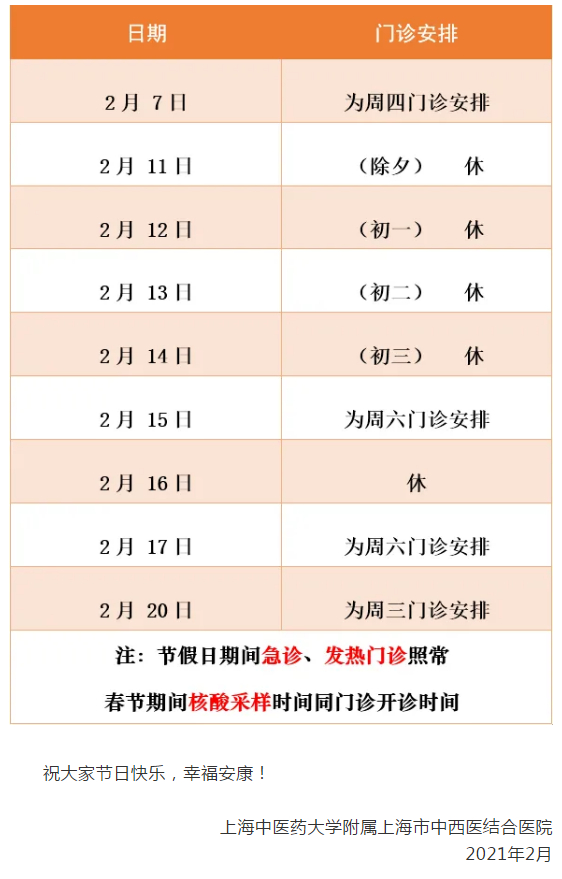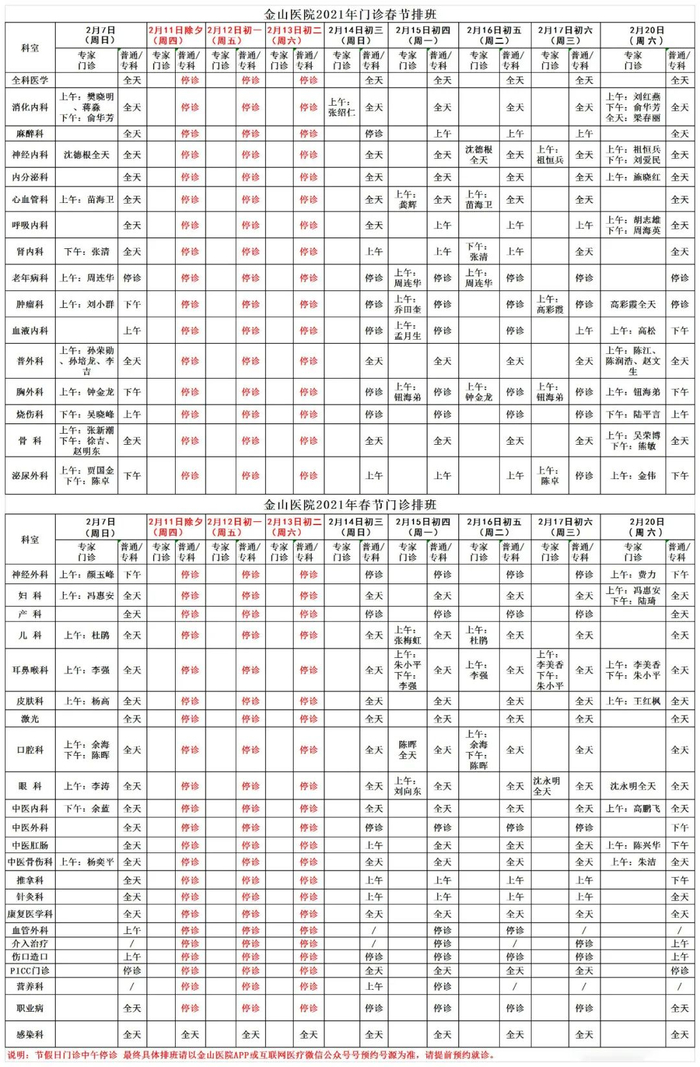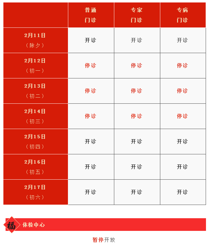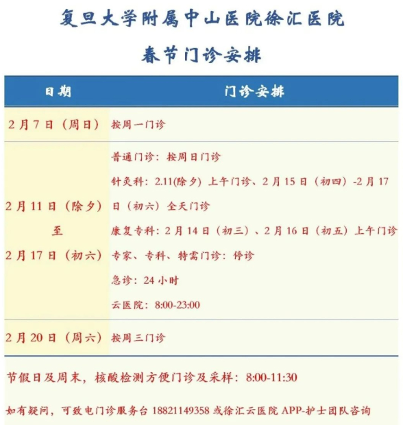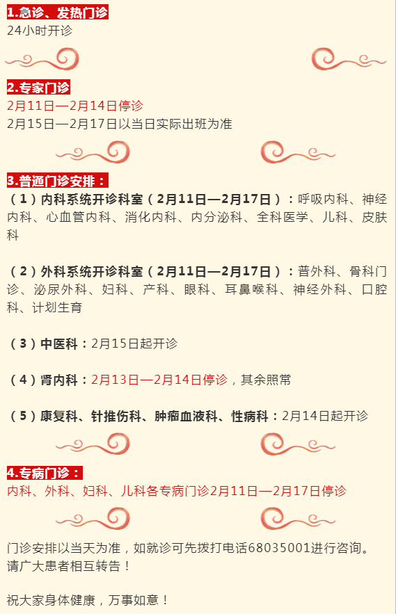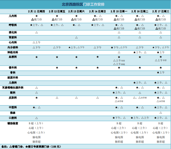 2月11日(周四)-2月17日(周三)门诊工作安排见下表。2月18日起各门诊照常开诊。2月7日、2月20日按原双休日门诊照常开诊。