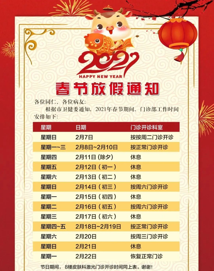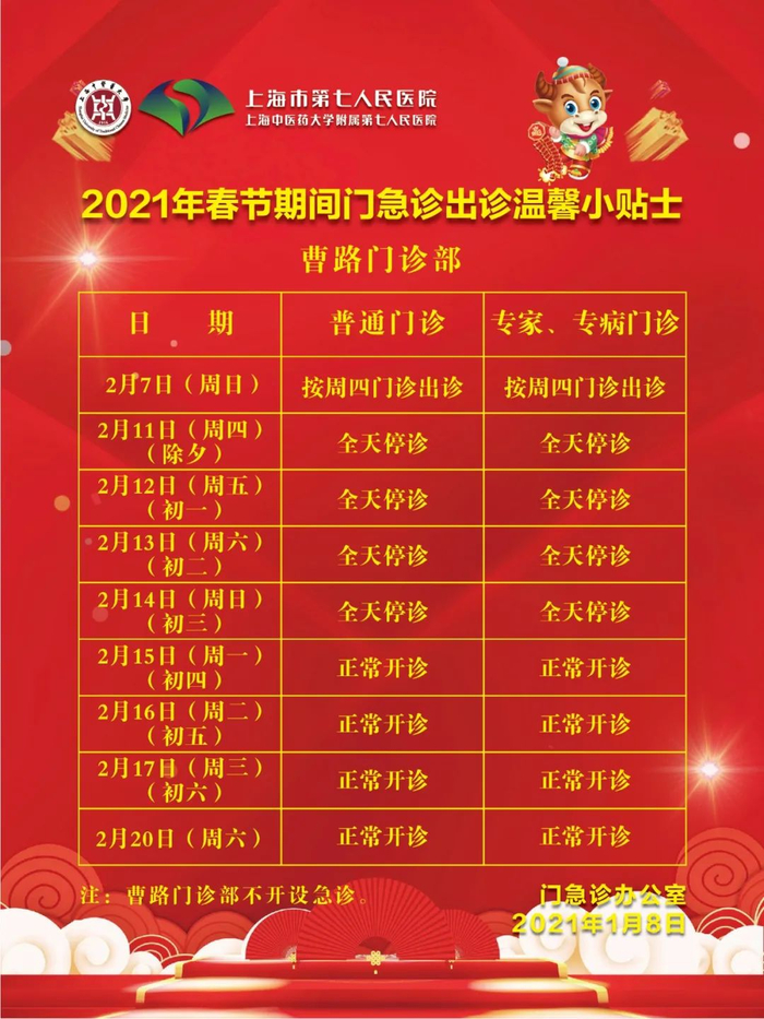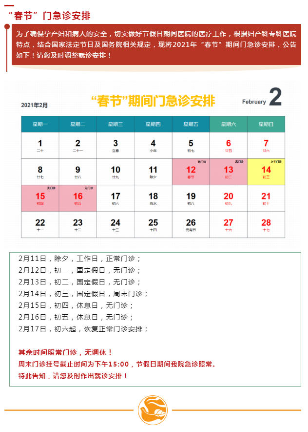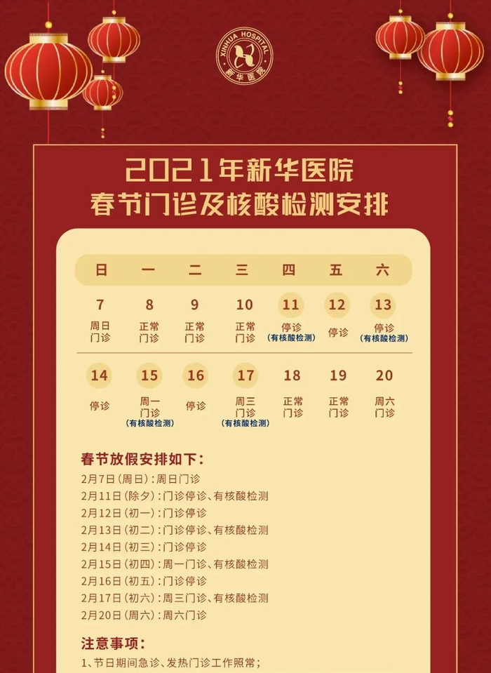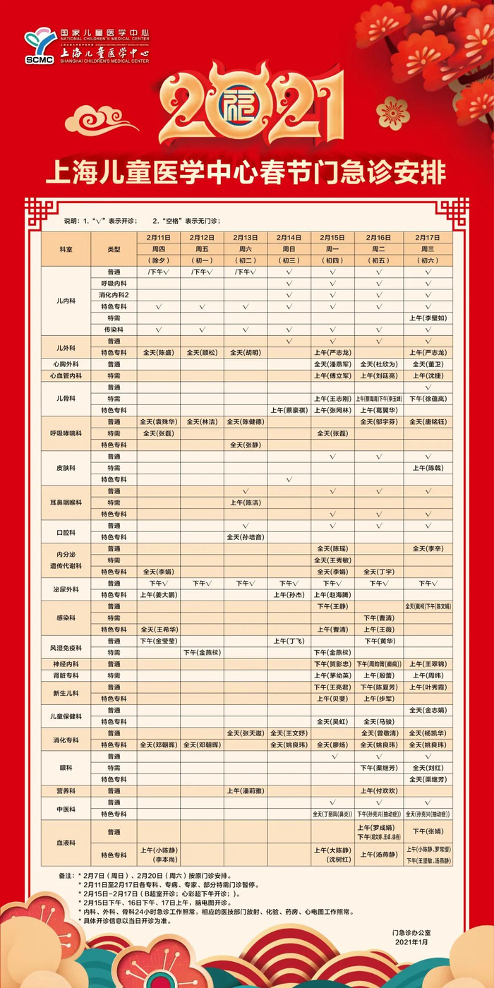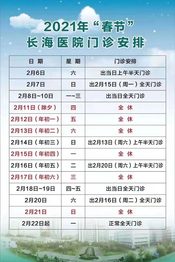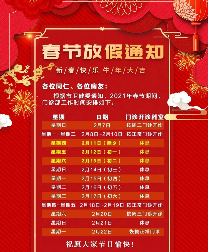 2月11日(周四)-2月17日(周三)门诊工作安排见下表。2月18日起各门诊照常开诊。2月7日、2月20日按原双休日门诊照常开诊。