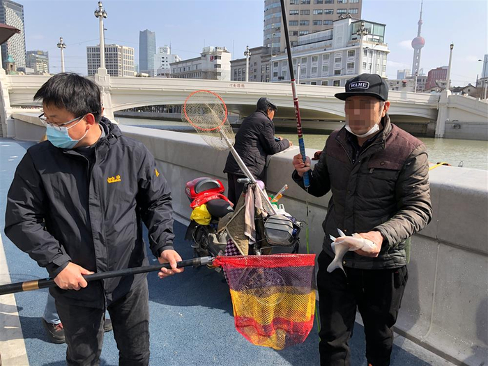2月2日,雨后的申城晴朗暖和,记者沿着北苏州路步道漫步。从四行仓库一路向东,美丽的河岸线上林立着怡和打包厂、上海总商会旧址等历史建筑,搭配精心设计的岸线步道,吸引不少游客市民驻足拍照。一过浙江路桥,岸边铁围栏上黄色的“请勿垂钓”大牌子很是醒目。提醒有用吗?北苏州路近河南路桥处,远远就能看到河岸步道上簇拥着一大群人,旁边还停着多辆电动自行车,阵阵嬉笑声不断传来。走近一看,10多人趴在防汛墙上,有人是垂钓者,有人是看客,有人专职拿着网兜来回辅助,将鱼从河里捞起来;1人为了方便垂钓,干脆踩着电动自行车爬上防汛墙坐着,大大咧咧地来回挥杆。数一数,共有7根钓鱼竿伸入河中,防汛墙上摆满饵料、毛巾等钓鱼用品,脚边则摆着大大小小的水桶,桶里装满钓上来的鱼。