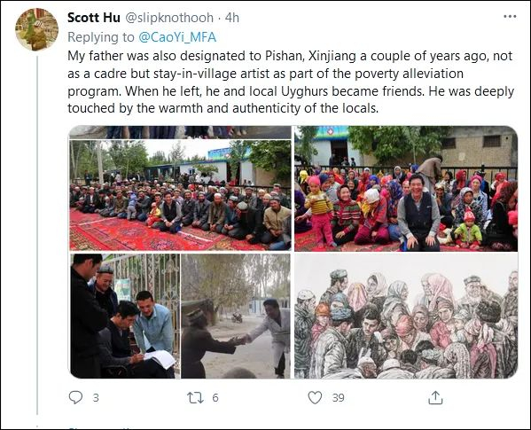 有网民写道:“几年前,我的父亲也被派到新疆皮山,不是作为干部,而是作为扶贫项目的驻村艺术家。离开时,他和当地的维吾尔族人成了朋友。当地人的热情和真诚深深地打动了他。”