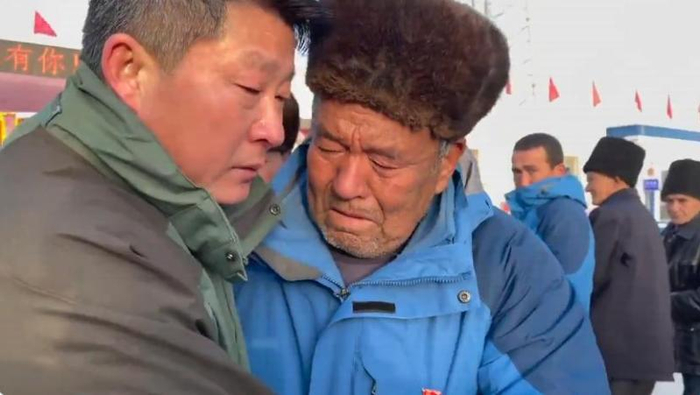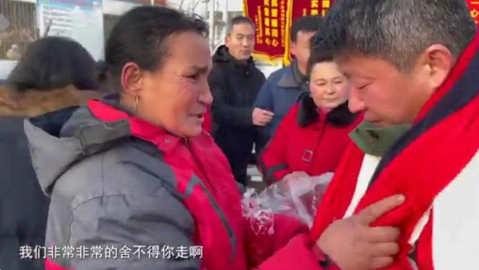 视频中,维吾尔族村民们正含泪送别一名驻村干部,有维族老人泣不成声地上前拥抱,而这名干部红着眼眶,只一个劲地说着:“谢谢、谢谢。”