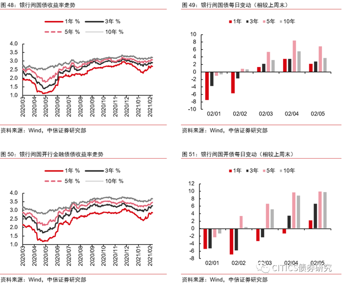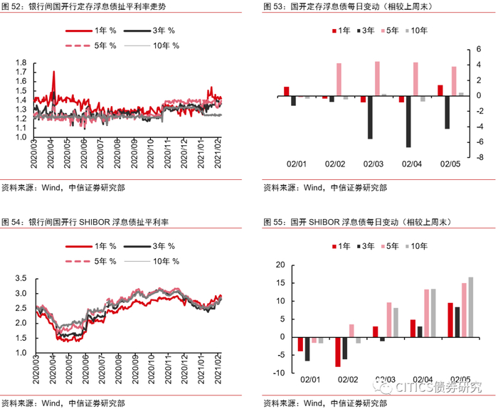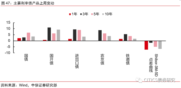 上周利率债收益率全面上行。截至2月5日,国债方面,1年期、3年期、5年期、10年期分别变动2.22bps、2.87bps、6.89bps、3.78bps。国开债方面,1年期、3年期、5年期、10年期分别变动0.88bps、11.07bps、6.21bps、9.44bps。
