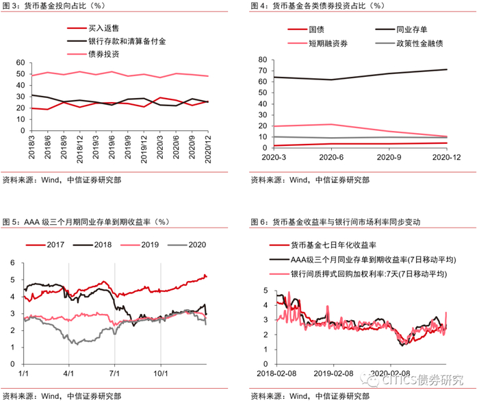 要理解货币基金收益率波动,主要关注货币基金底层资产收益情况。货币基金资金投向主要包括三项:债券投资、银行存款和备付金、买入返售。债券投资占比最大,约为50%。而债券投资中,同业存单占比最大,占比达到70%。因此同业存单收益会在很大程度上影响货币基金收益率。同业存单等债券受市场流动性影响,表现出较强的季节性,季末、年末利率通常走高,货币基金也呈现出年末利率走高的趋势,而年后收益率往往回调。另一方面,货币基金投资于短久期、低风险、高流动性债券,因此货币基金在操作上一般采用持有到期策略,并将这些债券资产归类为“持有至到期金融资产”,估值上采取“摊余成本法”计量,因此货币基金呈现的收益率波动性较同业存单收益率的波动性更小。并且货币基金收益率波动比同业存单滞后,同业存单收益率高峰一般在6月或12月中旬左右,而货币基金收益率高峰往往在7月或1月初,相较同业存单滞后半个月。
