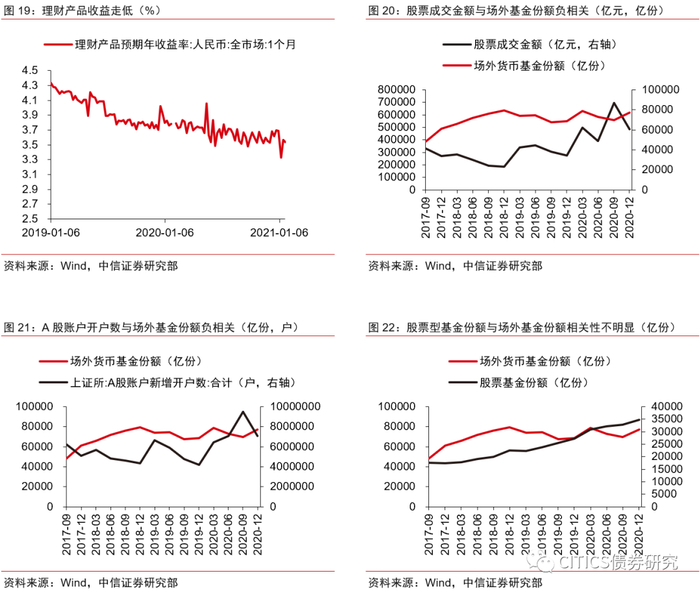 并且,场外货币基金规模与股市成交金额也呈现明显的负相关性,个人投资者也会在股市收益走高时赎回场外货币基金,进行股票投资。A股账户开户数与场外基金份额也呈现明显负相关性,体现出个人投资者通过赎回场外货基、独立开户的方式将资金配置于股票市场。而股票型基金份额与场外货币基金份额之间的联动关系并不明显。由于场外货币基金T+0赎回存在额度限制(多为1万元),场外场内资金转换的便利性也不如场内资金的流动,因此场外货币基金规模对股市涨跌的敏感性可能低于场内货币基金的敏感性。场外货币基金规模的变动会存在一定滞后。但由于场外货币基金规模仅能获取季度数据,因此这种滞后性在图中并未体现。去年四季度股市的震荡降低了股市成交金额,使投资者持有了更多的场外货币基金份额。