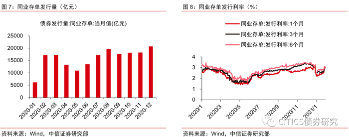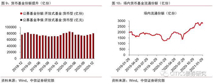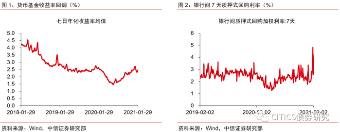 2020年下半年结构性存款压降任务量较大,银行发行了较多同业存单补充负债,同业存单发行利率也不断提升。但年底结构性存款压降任务完成,银行发行同业存单的动力可能减小,发行利率也将趋于稳定,并且年后流动性紧张的局面缓解,这可能会阻止货币基金收益率的进一步提升。