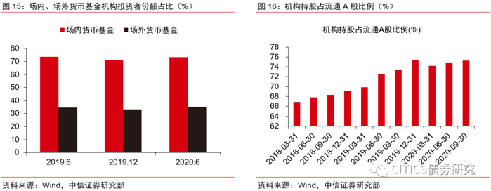 货币基金规模方面,需考虑货币基金持有人结构及其发挥的功能。场内货币基金作为投资者流动性管理的工具,其规模变动与股票收益密切相关。随着A股总市值波动上升,投资者持有的股票总价值也在上升,并且机构投资者持股比例不断提高,海外资金持续流入,场内货币基金作为流动性管理工具的需求将持续并且被强化,预计其规模也将总体呈现扩张趋势。并且,场内货币基金的持有者多为机构投资者,A股市场机构化趋势在日益加深,机构投资者有大额资金的管理需求,场内货币基金规模与股票收益之间的联动关系将更加紧密。