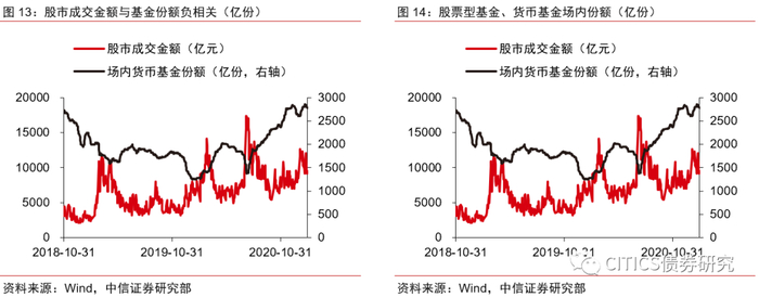 股市成交金额及股指与场内货币基金份额总体呈现负相关关系。股价上涨带动股市成交金额提高,投资者可及时卖出货币基金投向股票;股价下跌时,投资者往往持有货币基金等待机会。去年6-7月股指较大幅度上涨后总体处于震荡阶段,股市成交额也在低位震荡,场内货币基金份额也持续提升。去年年底至今年年初股市再次小幅上涨,股市成交额走高,场内货币基金份额也相应产生回调和波动。