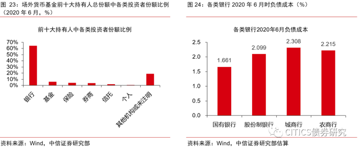 我们根据各类银行2020年半年报测算出2020年6月时各类银行的负债成本。我们分别使用MLF利率半年报披露的存款成本率融360披露的结构性存款到期收益率同业存款存入报价利率shibor隔夜利率银行间7天质押式回购利率,同业存单发行利率分别来估计央行借款、各类存款、结构性存款、同业存放、拆入资金、卖出回购、应付债券的成本。总体来说去年6月底时银行负债成本在1.6%到2.3%之间,大部分银行负债成本高于当时的货币基金收益率(1.7%左右)。而去年年底货币基金收益率达到了2.7%左右的高点,目前在2.4%左右,高于银行负债成本。