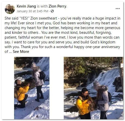 求婚当天,正是两人相识一周年的日子。蒋凯文当时非常激动,还在社交网站上写了篇小作文,表达了自己对未婚妻的浓浓爱意。