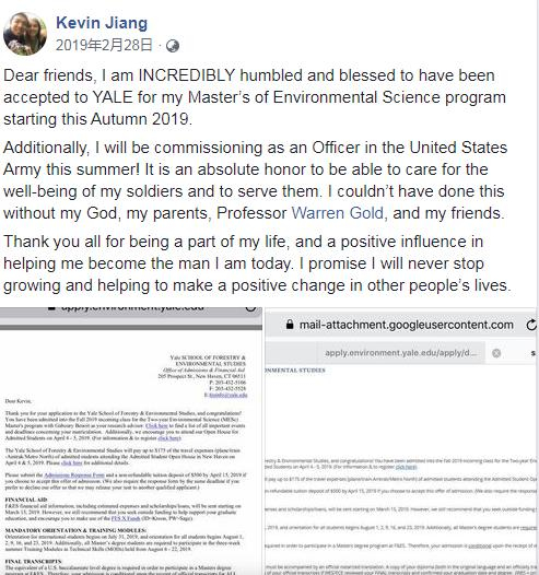 ·2019年蒋凯文接到耶鲁通知书后,兴奋地在社交网站发文,对父母、教授和所有帮助过他的朋友们表达了感谢,“谢谢大家让我成为更好的人,总是为我带来积极的影响,我一定会继续努力,争取也能给别人的生活带来好的改变!”