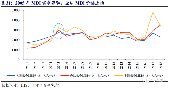 2005年MDI供给端激增并未对MDI价格造成拖累,美国房地产如火如荼,MDI需求旺盛驱动MDI价格大幅上扬。根据IHS数据统计,2005年美国聚合MDI价格约为2750美元/吨,同比增长16.0%;西欧地区聚合MDI价格约为2990美元/吨,同比增长41.7%;中国聚合MDI价格达到3267美元/吨,同比增幅高达76.9%。2005年,供给端的集中释放并未使得MDI价格出现回落,反而出现大幅增长,这是由于集中投放的新增产能迅速被下游消化,需求端保持强劲使得MDI价格大幅上扬。同时,可以观察到,在全球各地区聚合MDI售价方面,中国MDI价格在2005年至2009年间均大幅高于美国和西欧地区的售价。以2007年为例,中国MDI价格分别比美国和西欧地区的MDI价格高出24%和28%。这是因为那时中国冰箱冷柜等MDI下游应用领域正处于高速发展的腾飞阶段,对MDI需求量较大,而国内产能尚未能自给自足,对进口MDI的依赖度较大,海外巨头对于中国MDI市场价格具有较强的议价能力。