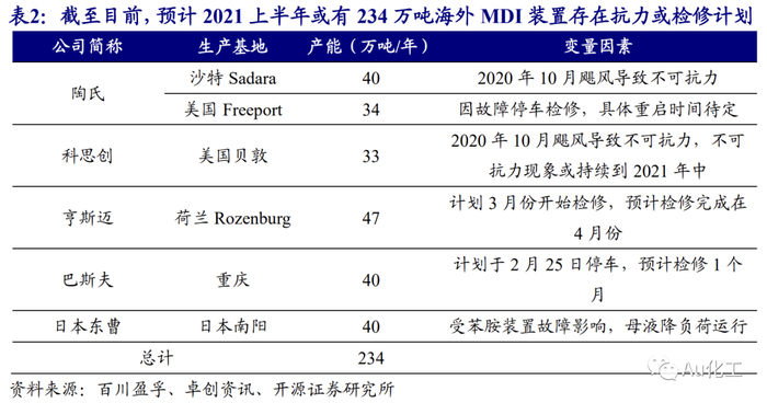 截至目前,预计2021上半年或有234万吨海外MDI装置存在变量。据卓创资讯和百川盈孚消息,海外地区存在检修计划和不可抗力的MDI装置共计有234万吨,其中包括:受前期飓风影响,美国陶氏34万吨MDI装置和美国科思创33万吨MDI装置自2020年10月均遭遇不可抗力,美国科思创不可抗力现象或持续到2021年中;陶氏化学Sadara工厂40万吨装置因故障停车检修,具体重启时间待定;亨斯迈位于荷兰罗镇堡47万吨MDI装置计划3月份开始检修,预计检修完成在4月份,后续情况仍有待跟进;重庆巴斯夫40万吨装置计划于2月25日停车,预计检修1个月;据2月2日百川盈孚消息,日本东曹40万吨装置受苯胺装置故障影响,母液降负荷运行。