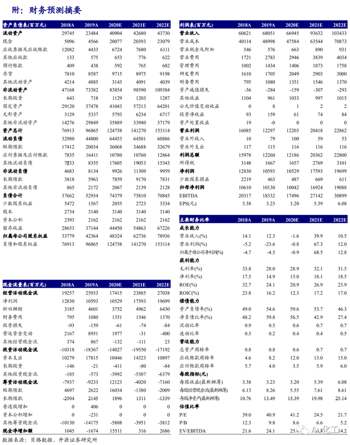 (3)精细化学品和新材料系列:2021-2022年,我们假设公司PC、PMMA、HDI、PBAT、尼龙12等新材料产能投放并贡献业绩,2021-2022年精细化学品和新材料业务营收保持29.68%、24.47%的高速增长,我们假设其2021-2022年的毛利率分别为25.30%、25.90%。