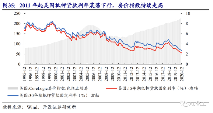 从2011年开始,美国房地产市场再度进入上行周期。2007年次贷危机爆发以来,美国财政采取了较为宽松的货币政策向市场释放流动性,按揭贷款利率持续走低,使得贷款购房的成本下降,激发了购买房屋的需求,引导房地产市场重新回到上行周期。凯斯-席勒房价指数自2009年触底后开始回升,表明房地产市场重新步入上行。据美国商务部统计,从2011年到2020年间,美国新房销量年复合增长率达到11.44%,二手房销售情况与新房走势接近,呈现持续增长态势。若从2011年开始算起,截至目前美国房地产已经历了为期10年的向上周期。