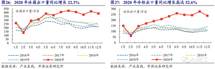 冰箱、冷柜等家电产品属于后地产链,房地产市场景气对冰箱冷柜消费同样具有显著带动作用。中国是家电制造和出口大国,冰箱冰柜出口占比呈逐年上升态势,据产业在线数据,截至2020年冰箱出口量占总销量的49.45%,冰柜出口量占总销量的65.41%。按洲别分,欧洲是中国最大的冰箱出口市场,占中国冰箱出口总量的38.30%;而在全球各国家中,美国是我国冰箱第一大进口国,2019年我国出口美国的冰箱总量占出口全球总量的14.5%。此外,据产业在线数据,2020年我国冰箱出口量增长占据冰箱总销量增长的65.49%,冰柜出口量增长占冰柜总销量增长的90.83%,因此,2020年冰箱冷柜出口订单强势增长是冰箱冷柜销量大幅上升的主因。中长期来看,随疫苗陆续接种完毕,原本受疫情激发的储存食物的需求或将减弱,但是美国房地产市场的高景气或将持续刺激后地产链冰箱冷柜的市场消费。我们认为,建筑保温材料和冰箱冷柜作为MDI两大主要需求来源,在本轮美国房地产周期景气上行的带动作用下,具有较强的增长动力。