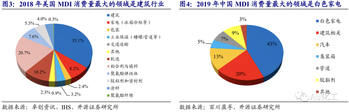 MDI终端应用范围广泛,包括建筑、家电、汽车、服装等行业,其中聚合MDI主要用于生产聚氨酯硬泡,多应用于冰箱冷藏、建筑等行业;纯MDI主要用于生产聚氨酯浆料、鞋底原液等,应用领域包括合成革、氨纶、制鞋等行业。美国市场中,建筑保温材料和冰箱冷藏领域的消费占美国MDI消费总量的43.3%。2018年,据IHS数据,在美国MDI消费结构中,建筑用MDI消费占比35.1%,是MDI最大的消费领域;其次是粘合剂与填料,占比20.7%;消费量排名第三位的是注塑成型的聚氨酯软泡,占比10.2%,一般来说TDI是聚氨酯软泡的主要原材料,但是在美国市场,近年来以聚合MDI为原材料的聚氨酯软泡增长也较为明显,其主要应用领域是床上用品和家居市场,如聚氨酯记忆海绵;消费量排名第四位的是冰箱冷藏,占比8.2%。在我国,冰箱冷柜和建筑保温材料的MDI消费占比我国总MDI消费量的44.1%,同时我国MDI消费结构与美国有较大差异。中国是家电大国,2019年我国MDI下游消费量最大的行业是白色家电,以冰箱冷柜为主,占比高达43%;其次是建筑相关占比20%;第三位和第四位是汽车和胶粘剂,分别占比13%和9%。因此,我们认为来自建筑保温材料和白色家电这两方面的下游需求增长将对MDI整体销量产生可观的积极作用。