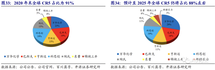 截至2020年底,全球MDI年产能为924万吨左右,CR5占比高达91%。其中,万华化学产能全球领先,目前拥有MDI年产能210万吨,占比全球总产能的23%,巴斯夫占比19%、科思创占比19%、亨斯迈占比15%、陶氏化学占比15%。根据各大公司已公布的扩产计划,预计2021-2025年,万华化学、科思创、巴斯夫将分别新增产能130万吨、46万吨、30万吨。其中,万华化学烟台基地将新增50万吨,宁波基地将新增30万吨,BC公司扩产10万吨,福建基地新增40万吨。除此之外,新疆和山巨力计划新建MDI产能40万吨,目前尚未有实质性推动,韩国锦湖计划投产20万吨,具体投产时间仍待定。即便乐观假设,2025年之前以上新增266万吨产能全部投放,全球MDI产能将达到1190万吨,预计CR5占比仍高达88%左右,即未来5年内MDI行业仍将继续维持寡头垄断格局。