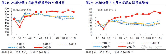 2020年4月以来冰箱冷柜销量快速回暖。根据产业在线数据,2020年2月,由于受到疫情影响,工厂开工受限,我国冰箱冷柜整体销量进入较为低迷的状态,其销量分别为272.7万台、105.3万台,分别同比下降35.4%、27.3%。进入2020年3月以来冰箱和冰柜销量呈现强势的V形反转,4月冰箱销量提升至658.8万台,基本恢复至2019年同期水平;4月冰柜销量大幅反弹至291.4万吨,实现了同比增长16%。这主要是由于2020年4月国内疫情得到初步控制,购买渠道与物流渠道逐渐恢复,1月至3月积累的购买需求于4月得到释放;其次,进入4月后天气温度逐渐上升,每年4月~9月是冰箱冷柜的传统销售旺季,季节因素对冰箱冰柜销售产生一定提振作用。根据产业在线数据,2020年冰箱总销量达8,447万台,同比增长8.94%;冷柜总销量达3,720.1万台,同比增长高达39.75%。