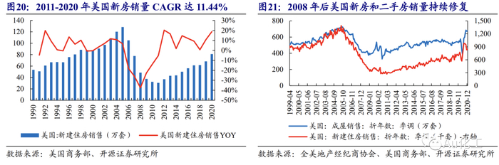 2020年美国抵押贷款利率持续创历史新低,对房屋销售起到强劲的刺激作用。根据Freddie Mac数据,截至2021年2月4日,15年期、30年期抵押贷款固定利率分别为 2.21%、2.73%,已经触及历史最低水平。虽然受到新冠疫情的冲击,美国经济发展速度放缓,但近半年以来美国房地产市场再度迎来强势崛起,新房和二手房销售量快速增长。2020年初新冠疫情发生初期,美国新房和二手房销售急剧下降,并分别在4月和5月触底,5月、6月迎来强势反弹。根据美国商务部数据,新房销售量于2020年7月达到高峰,同比增速为48.1%,此后增速虽有所下滑,但是截至2020年12月同比增速依然为15.18%;根据全美地产经纪商协会数据,二手房销售量于 2020年10月达到峰值,同比增速为26.8%。截至12月增速依然稳定在22%左右。