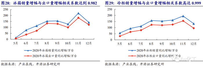 从出口端来看,美国房地产景气度上升和疫情期间储存食物的需求为冰箱冷柜市场带来了增长动能。根据产业在线数据,2020年冰箱出口量为4,177.3万台,同比增长22.3%;冷柜出口量为2,433.1万台,同比增长高达52.6%。通过对比2020年5月起的冰箱冷柜销量增幅情况与冰箱冷柜出口量增幅情况,可以看出销量增幅与出口量增幅呈现高度一致性,并且在数额上较为接近。通过计算相关系数,冰箱销量增幅与出口量增幅相关系数达到0.982;冷柜销量增幅与出口量增幅相关系数高达0.999。因此我们认为,2020年我国冰箱冷柜销量创下新高的主要原因是海外需求旺盛。海外冰箱冷柜市场火热主要原因有以下两点:(1)美国房地产强势复苏,新房和二手房销量持续创新高,地产链复苏对建筑、家电等需求起到良好刺激作用;(2)疫情期间各国居民的生活方式发生了一定转变,养成了疫情宅家、储存食材的生活习惯,带动冰箱冷柜需求大幅增长。