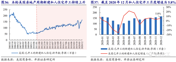 美国房地产周期上行仍将持续,建筑保温材料、冰箱冷柜有望维持旺盛需求。当前美国抵押贷款利率仍处于历史低位,房地产市场景气度较高,房屋销售量价齐升。2020上半年,新冠疫情爆发对全球经济发展造成较为严重的负面影响,为刺激经济回暖,美国或将继续维持相对宽松的货币政策,抵押贷款利率有望继续处于低位。此外,结合哈里森模型推测,本轮美国房地产周期仍处于快速上行阶段,2011年至今新建私人住宅的开工数持续攀升,截至2020年12月已开工的美国新建私人住宅增速维持在5.8%。因此,我们认为美国房地产处于本轮周期的景气上行阶段,高景气仍将持续,将直接拉动建筑保温材料市场需求。