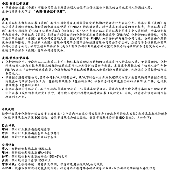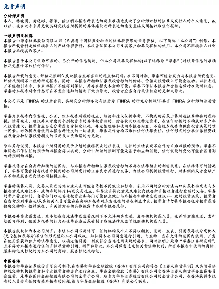 在任何情况下,本公众号中的信息或所表述的意见均不构成对客户私人投资建议。订阅人不应单独依靠本订阅号中的信息而取代自身独立的判断,应自主做出投资决策并自行承担投资风险。普通投资者若使用本资料,有可能会因缺乏解读服务而对内容产生理解上的歧义,进而造成投资损失。对依据或者使用本公众号内容所造成的一切后果,华泰证券及作者均不承担任何法律责任。