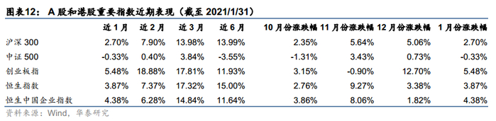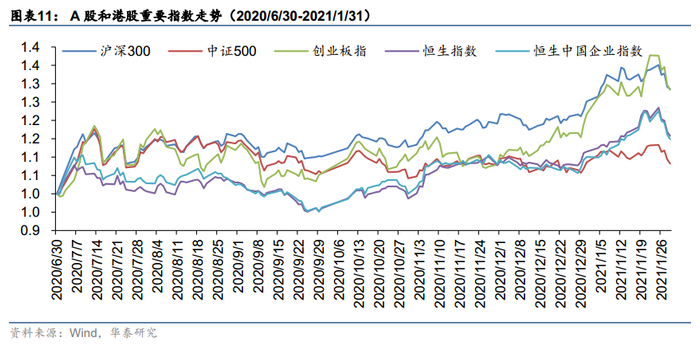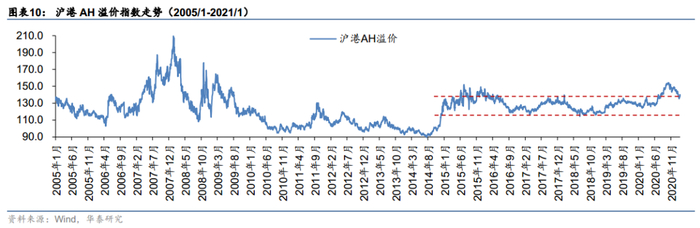 2020/10-2021/1期间港股表现优于A股,10月、11月恒生中国企业指数涨幅高于沪深300、中证500和创业板指,12月、1月也依然是正收益。所以在此期间AH溢价指数有所回落,从10月9日的154最高点下降到1月29日的140点。这一点位依然是2014年12月沪港通开通以来的历史较高水平,后续仍有下行的空间,也就意味着港股相对A股或更强。