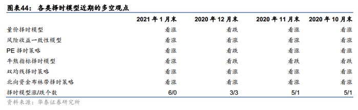 每个择时模型都会在月末发出看多或者看空的信号,如果我们综合各类择时模型的多空观点,加总可得到对于股市的最终看多信号个数。