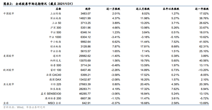 近一月(2021/1/1-2021/1/31)全球股票表现涨跌不一,商品涨幅减弱。全球主要股指中,中国创业板指领涨,欧洲股市领跌。A股各行业涨跌参半,银行业表现亮眼,综合金融等行业调整。今年以来周期和消费股表现较优,其中消费股PE_TTM分位数已处于自2013年的历史高位。1月CRB指数中,金属现货上涨较多。1月中国国债利率上涨,美国中长期限国债利率走高,欧盟中长期公债利率下降。中债新综合净价指数、国债净价指数、信用债净价指数近一月总体平稳。美元指数则受美债长期利率上行的影响而在1月转头上行。