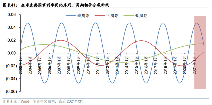 随后,我们选取中国、美国、日本、德国、英国、法国和澳大利亚等重要国家的十年期国债利率,提取其同比序列(意为12个月差分序列)的42个月、100个月、200个月周期滤波序列并分别合成相位,形成全球利率的三周期序列,以便能够综合地观察全球利率的三周期状态。我们发现,当前全球重要国家利率合成后的同比序列,处于短周期上行,中周期上行,长周期位于顶部区域的状态。