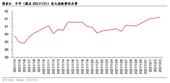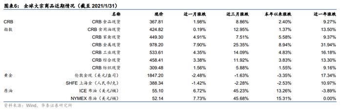 1月份商品市场涨跌品种不一,CRB金属现货涨幅最高,为7.90%。美油和布油价格持续回升,分别上涨6.72%和7.73%。黄金价格持续下跌,伦敦金跌幅0.40%,上海金下跌1.42%。