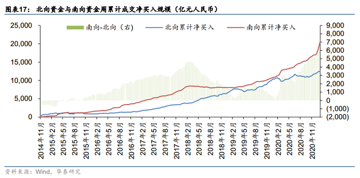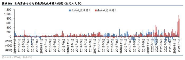 互联互通机制下,内地投资者日益关注港股市场并成为重要参与者,南向资金的规模在2021年初大幅增长,且整体上南向资金累计净买入规模大于北向资金,二者差值自2020年2月开始逐步扩大,2021年南向资金净买入规模迅速扩大,一定程度上带动港股上涨。我们认为未来南向资金规模相较前期会上一个新台阶,类似北向资金规模在2018年扩大后,成交净买入明显高于2014-2017年,这种扩大趋势短期内较难改变,南向资金规模也许不能一直维持在1月份的水平,但总体上应该会高于2014-2020年的平均值水平。在这样的背景下,港股市场仍会继续吸引内地投资者的注意,南向资金有望继续成为支撑港股的重要力量。