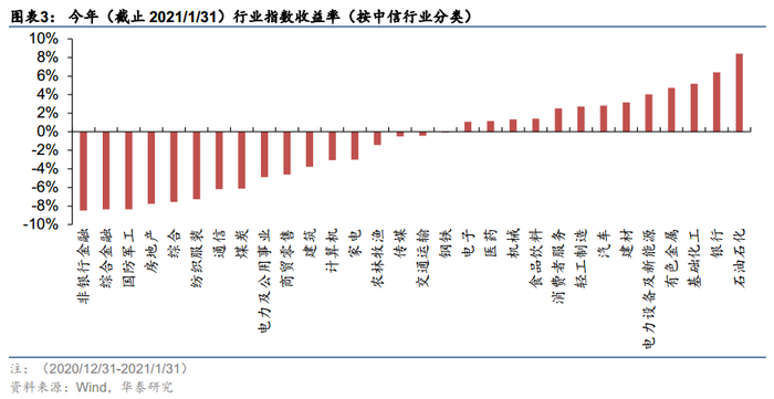 1月石油石化指数收益最高,上涨8.42%;银行行业指数次之,为6.40%,基础化工、有色金属和电力设备及新能源等行业涨幅靠前。在下跌的行业指数中,非银金融跌幅达8.48%;综合金融、国防军工和房地产等行业也表现落后。