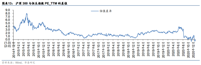 我们将沪深300和恒生指数的PE_TTM做差值,来代表AH股的估值差异,并重点关注2014年12月沪港通开通后估值差异的走势。从图上可以看出,从沪深港通开通以来,A股与港股的估值差异整体上逐渐缩窄,2019年初虽有所扩张,但从2020年下半年开始大幅下降,当前正处于自2014年12月以来的较低水平。